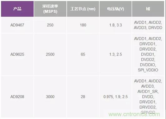 數字電路不需要裕量,因為最重要的參數是速度。所以,數字電路通常以最低電源電壓運行,以獲取CMOS開關速度和功耗的優勢。這在新一代ADC中很明顯,最低電壓軌已降低至0.975 V。下面的表1列出了若干代的一些常見ADC。