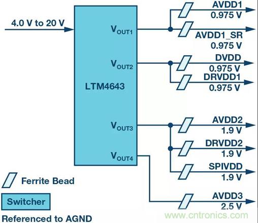 圖3. AD9208 PDN,DC-DC轉換器為所有域供電