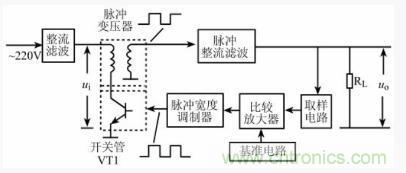 脈沖整流濾波后的 uo電壓一方面為負載 RL供電,另一方面加到取樣電路上。當輸出電壓變化時,取樣電路取樣后的電壓加到比較放大電路,與基準電壓比較后的電壓信號再送至脈沖寬度調制器,調制后的脈沖信號控制VT1的導通與截止的占空比。