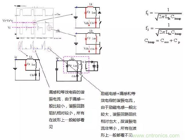 f1比f2大很多(從波形上可以看出),這是由于漏感一般相對較小;同時由于f1所在回路阻抗比較小,諧振電流較大,所以能夠很快消耗在等效電阻上,這也就是為什么f1所在回路很快就諧振結(jié)束的原因!(具體諧振時間可以通過等效模型求解:二次微分方程估算)