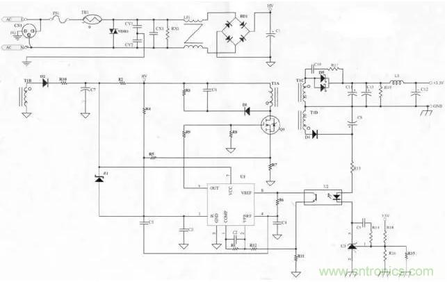 因?yàn)檩敵鰹?.3V,而TL431的Vref值為2.5V,若再加上photo coupler上的壓降約1.2V,將使得輸出電壓無(wú)法推動(dòng)Photo coupler及TL431,所以必須另外增加一組線圈提供回授路徑所需的電壓。
