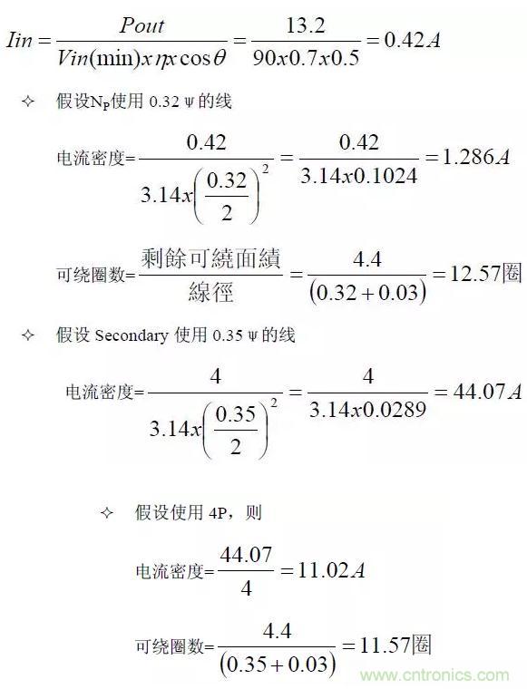 當(dāng)變壓器決定后,變壓器的Bobbin即可決定,依據(jù)Bobbin的槽寬,可決定變壓器的線徑及線數(shù),亦可計(jì)算出線徑的電流密度,電流密度一般以6A/mm2為參考,電流密度對(duì)變壓器的設(shè)計(jì)而言,只能當(dāng)做參考值,最終應(yīng)以溫升記錄為準(zhǔn)。