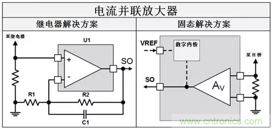 繼電器解決方案需要單獨(dú)的分立放大器電路來(lái)增加在檢測(cè)電阻上測(cè)量的電壓。