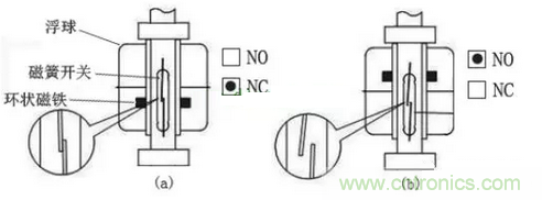 圖(a):當水位下降時,環(huán)狀磁鐵下降,磁簧開關(guān)處于接通狀態(tài);