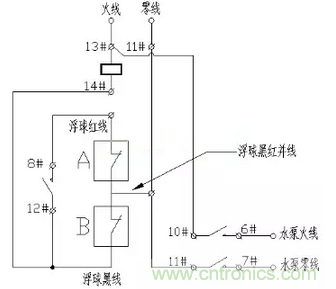 上圖中,6#與10#、7#與11#、8#與12#是繼電器常開觸點,13#與14#繼電器線圈觸點,A和B分別是雙浮球的上下限位開關(guān)。該電路只有當水位下降至最低限位之后才會工作。