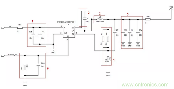 圖中分為6個部分,按照序號,分別為:輸入電容,自舉電容,電感,反饋電阻,輸出電容,緩啟動。