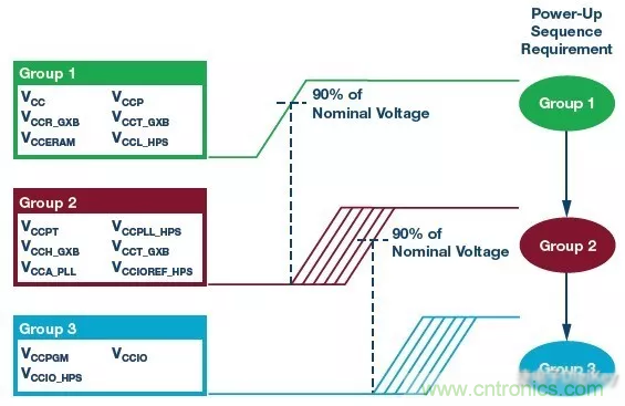 市場(chǎng)中較新的FPGA在規(guī)格中會(huì)提供針對(duì)啟動(dòng)和關(guān)斷電源時(shí)的序列順序提出特定的要求,確保FPGA正常開啟及復(fù)位,保持最小的電流消耗,并在電源轉(zhuǎn)換期間將I/O保持在正確的三態(tài)配置下。再以Arria 10為例,其技術(shù)規(guī)格將電源分為三個(gè)序列組(1、2、3),并要求它們按升序排列為1、2、3,然后按相反的順序降序排列:3、 2、1。