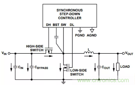 圖1所示為一個同步降壓調節器設計,它包括一個開關控制器和以下外部電源器件:高端開關、低端開關、電感、輸入電容、輸出電容和旁路電容。圖1中的箭頭表示高開關電流流向。必須小心放置這些電源器件,避免產生不良的寄生電容和電感,導致過大噪聲、過沖、響鈴振蕩和接地反彈。