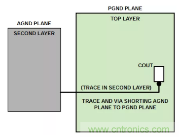 AGND層一路擴展到輸出電容,AGND層和PGND層在輸出電容的負端連接到過孔。
