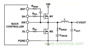在DH或DL引腳上串聯一個小電阻(約2 Ω至4 Ω)可以減慢柵極驅動,從而也能降低柵極噪聲和過沖。另外,BST與SW 引腳之間也可以連接一個電阻(參見圖6)。在布局期間用0 Ω柵極電阻保留空間,可以提高日后進行評估的靈活性。增加的柵極電阻會延長柵極電荷上升和下降時間,導致 MOSFET的開關功率損耗提高。