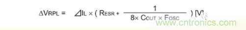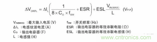 以下是表示輸出紋波電壓的公式。電容器的紋波電壓和ESR的紋波由于相位偏離,故無法進行單純的加算,不過卻是紋波電壓的最差值概算常用的公式。