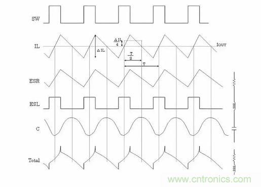 通過開關所產(chǎn)生的電感電流紋波ΔIL將產(chǎn)生與ESR成單純正比的紋波電壓,有些ESL則會產(chǎn)生方形波電壓,與電容值部分合成,最下方波形成為最終的輸出紋波電壓波形。