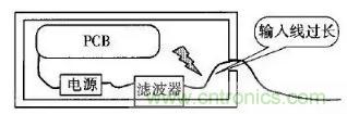 許多設備的電源線進入機箱后,經過很長的導線才接到濾波器的輸入端。例如,電源線從機箱后面板輸入,走行到前面板的電源開關,又回到后面板接到濾波器。或者濾波器的安裝位置距離電源線入口較遠,造成引線太長(如圖1所示)。