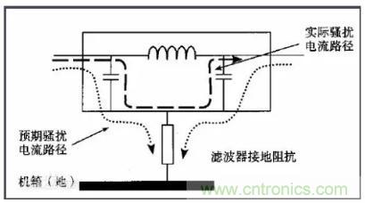由于接地線較長,在高頻時導線的分布電感不能忽視。如果濾波器搭接良好,干擾信號可以通過殼體直接接地。如果濾波器的殼體和機箱之間搭接不良,相當于濾波器的殼體(地)與機箱之間存在一個分布電容,這將導致濾波器高頻時接地阻抗較大,尤其在分布電感和分布電容諧振的頻率附近,接地阻抗趨于無窮。