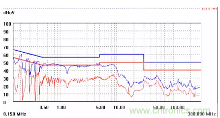 圖一a可以看出,改變PCB布局后130M-200M已經完全被衰減,但是30-130M沒有圖一效果好,可能變壓器出線無交叉好一些。仔細觀察,此IC具有抖頻功能,傳導部分頻段削掉了一些尖峰;