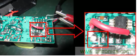通過斷開PCB銅箔使用一根導線連到輸出電容地,隔開ME4312B芯片地,如下圖: