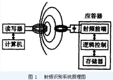 通常情況下, RFID 的應用系統主要由讀寫器和RFID 卡兩部分組成的,如圖1 所示. 其中,讀寫器一般作為計算機終端,用來實現對RFID 卡的數據讀寫和存儲,它是由控制單元、高頻通訊模塊和天線組成.而RFID 卡則是一種無源的應答器,主要是由一塊集成電路( IC) 芯片及其外接天線組成,其中RFID 芯片通常集成有射頻前端、邏輯控制、存儲器等電路 ,有的甚至將天線一起集成在同一芯片上 .