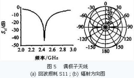 半波偶極子天線模型如圖4a 所示. 天線采用銅材料(電導率:5.8e7 s/ m ,磁導率:1) ,位于充滿空氣的立方體中心. 在立方體外表面設定輻射吸收邊界. 輸入信號由天線中心處饋入,也就是RFID 芯片的所在位置. 對于2. 45 GHz 的工作頻率其半波長度約為61mm ,設偶極子天線臂寬w 為1 mm ,且無限薄,由于天線臂寬的影響,要求實際的半波偶極子天線長度為57mm. 在Ansoft HFSS 工具平臺上, 采用有限元算法對該天線進行仿真,獲得的輸入回波損耗S11 分布圖如圖5a 所示,輻射場E 面(即最大輻射方向和電場矢量所在的平面) 方向圖如圖5b 所示. 天線輸入阻抗約為72 Ω ,電壓駐波比(VSWR) 小于2.0 時的阻抗帶寬為14. 3 % ,天線增益為1.8.