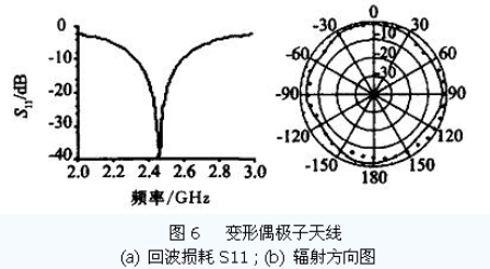 從圖5b 可以看到在天線軸方向上,天線幾乎無輻射. 如果此時讀寫器處于該方向上,應答器將不會做出任何反應. 為了獲得全方位輻射的天線以克服該缺點,可以對天線做適當的變形,如在將偶極子天線臂末端垂直方向上延長λ/ 4 成圖4c 所示. 這樣天線總長度修改為(57. 0 mm + 2 ×28. 5 mm) ,天線臂寬仍然為1 mm. 天線臂延長λ/ 4 后,整個天線諧振于1 個波長,而非原來的半個波長. 這就使得天線的輸入阻抗大大地增加,仿真計算結果約為2 kΩ. 其輸入回波損耗S11如圖6a 所示. 圖6b 為E 面(天線平面) 上的輻射場方向圖,其中實線為仿真結果,黑點為實際樣品測量數據,兩者結果較為吻合說明了該設計是正確的. 從圖6b 可以看到在原來弱輻射的方向上得到了很大的改善,其輻射已經近似為全方向的了. 電壓駐波比(VSWR) 小于2. 0 時的阻抗帶寬為12.2 % ,增益為1.4 ,對于大部分RFID 應用系統,該偶極子天線可以滿足要求.
