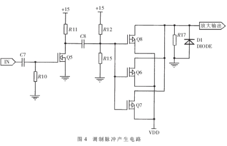 弱脈沖放大電路的輸出脈沖通過控制MOS管的通斷控制電容的充放電,從而形成符合要求的調制脈沖,驅動振蕩器工作。調制脈沖產生電路如圖4所示。