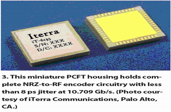 iTerra是另一家廣泛采用PCTF封裝技術(shù)的公司,該公司主要生產(chǎn)高端微波器件以及高速數(shù)字、光纖通訊網(wǎng)絡(luò)產(chǎn)品。iTerra生產(chǎn)的10.709 Gb/s NRZ(不歸零)到RZ(歸零)編碼器,采用了高氣密型(1×10-8 cm2/s)無引腳陶瓷PCTF封裝,能有效地散發(fā)出其5瓦的功耗,該模塊集成度高,電路密度大(圖3)。采用PCTF封裝,配上阻抗匹配電路,該模塊可以保證較寬溫度范圍內(nèi)的信號完整性(小于8ps的抖動)。