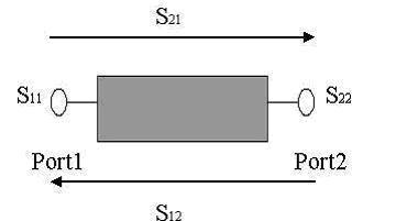 二端口網(wǎng)絡(luò)有四個S參數(shù),Sij代表的意思是能量從j口注入,在i口測得的能量,如S11定義為從Port1口反射的能量與輸入能量比值的平方根,也經(jīng)常被簡化為等效反射電壓和等效入射電壓的比值,各參數(shù)的物理含義和特殊網(wǎng)絡(luò)的特性如下: