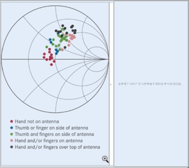圖6:天線的阻抗變化(圖中文字:各種用戶動(dòng)作產(chǎn)生與理想值不同的各種天線阻抗值)