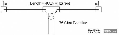 偶極型天線如圖呈T型,T型的水平部分長度為波長的1/2,波長若12.5cm,則T型水平部分長度應為6.25cm。