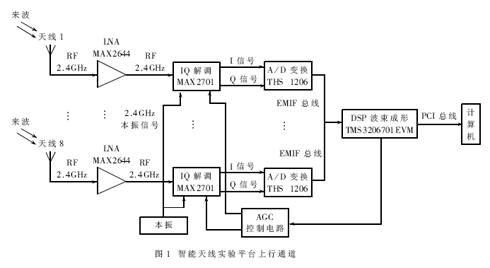 為了開展智能天線技術研究,結合實際情況,筆者設計了一個基于TI公司TMS320C6701數字信號處理器的智能天線實驗平臺。該平臺采用8單元天線陣列,工作頻率為2.4GHz,采樣速率為1.5MHz,采用TI公司的TMS320C6701EVM作為數字波束成形和控制算法實現單元,用于在實際信號環境下智能天線控制算法測試、MIMO技術研究和其他陣列信號處理技術的研究。實驗平臺的上行通道如圖1所示,下行通道如圖3所示。