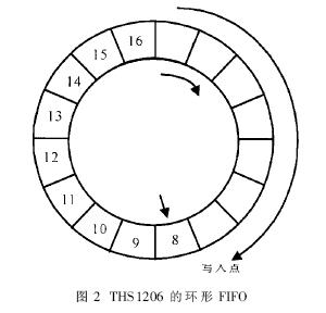THS1206內部的FIFO安排成環形,采用讀取點、寫入點和觸發點控制讀寫操作,如圖2所示。芯片的轉換時鐘CONV_CLK控制采樣保持和A/D變換,CONV_CLK讓四個通道的信號同時采樣保持,然后分別轉換為數字信號并自動順序寫入FIFO,同時FIFO的寫入點向前移動,指示下一個寫入點;當FIFO內的數據達到預定的觸發深度時,發出數據就緒信號DATSA_AV發出,DSP讀取轉換數據,同時清除DATA_AV信號,讀取點和觸發點向前移動。芯片的工作方式由兩個寄存器控制,通過寫寄存器,可以選擇使用通道、工作模式、FIFO觸發深度、DATA_AV的極性與觸發方式等。