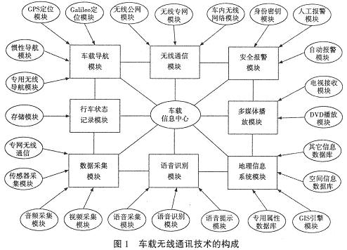 車載無線通訊技術由車載導航模塊、車載無線通信模塊、安全報警模塊、行車狀態記錄模塊、多媒體播放模塊、數據采集模塊、語音識別模塊、地理信息系統模塊八部分組成。所有的數據都通過車載信息中心進行處理、協調,并作出正確的反應。圖l為車載無線通訊技術的構成。