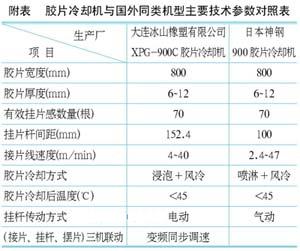 膠片冷卻機與密煉機、壓片機配套使用。將密煉機煉好的塑煉膠或混煉膠,經(jīng)壓片后,膠片進入該機進行浸泡,涂隔離劑后進入掛桿,經(jīng)冷卻干燥,最后進行連續(xù)疊片。這種膠片冷卻機是集日本、英國、臺灣等廠家的長處為一體,增加自主創(chuàng)新抓膠片的機械手部分,傳動裝置全部采用日本富士交流變頻器,實現(xiàn)抓膠片自動化、傳動調(diào)速同步化的自動控制系統(tǒng)。膠片冷卻機與國外同類機型主要技術參數(shù)對照表如附表所示。