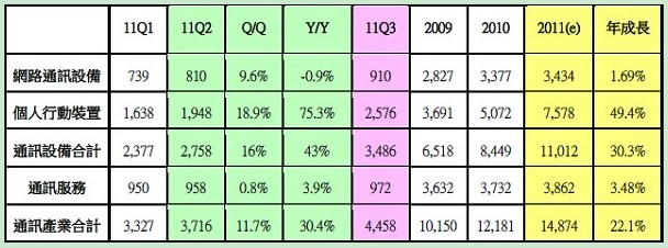 其中個人行動裝置市場仍是以手機產(chǎn)品為主要成長動能,而第二季起廠商開始推出雙核心或不同作業(yè)系統(tǒng)之產(chǎn)品來吸引消費者。因此整體通訊設備產(chǎn)業(yè)在 2011年第二季之產(chǎn)值為2,758億新臺幣,較2011年第一季成長16%,較2010年第二季成長約43%。
