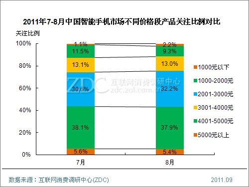 (圖)2011年7-8月中國智能手機市場不同價格段產品關注比例對比