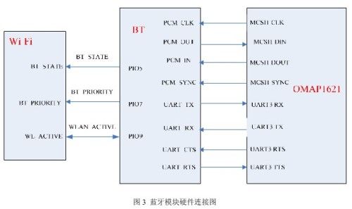 AFH技術在上面已經介紹過了,單獨使用AFH技術使用藍牙耳機的通話效果不是很好,為了解決這種問題,在使用AFH技術的基礎上又使用了三線共存(時分復用)技術。三線共存,顧名思義,就是使用三根線連接Wi-Fi和藍牙,下面結合圖3中Wi-Fi和藍牙所示的三線連接圖來描述一下三線共存的機制,其中主處理器使用的是TI公司的OMAP1621芯片。
