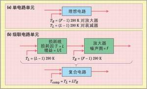 上列方程中,TR和TL分別為放大器(接收電路)和衰減器(損耗線)的有效溫度,F和L分別代表噪聲譜和損耗因子。圖2b是應用于一對級聯電路元件(一條損耗線加上一個放大器)的模型,其中損耗線的增益可表示為1/L。