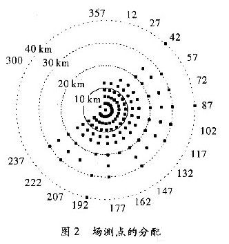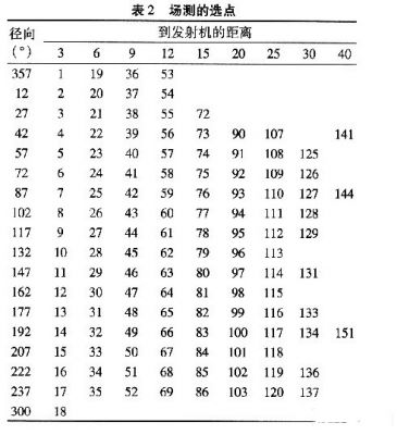 覆蓋測試是根據(jù)特定的半徑和幅角在圓周上進(jìn)行選點(diǎn)的,這些測試點(diǎn)的選擇總共包含18個(gè)不同幅角(12,27,42,58,72,87,102,117,132,147,162,177,182,207,222,287,300,357),對應(yīng)于以發(fā)射機(jī)為圓心的3,6,9,12,15,20,25,30和40 km這幾個(gè)半徑上。選點(diǎn)是出于幅角的考慮,展現(xiàn)了至少45 dBμV/m內(nèi)的場強(qiáng)估計(jì),并根據(jù)地形信息通過算法得到有用信息。圖2展示了場測選點(diǎn)的地形分配,測試點(diǎn)的具體參數(shù),如表2所示。