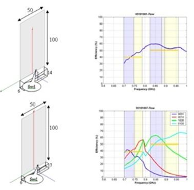 下面這個例子很好地說明了調(diào)諧方法在天線體積減小方面帶來的好處。這里用3D電磁建模程序分析兩種不同的天線配置:一種是寬帶設(shè)計;另一種是可以在相同頻率范圍內(nèi)調(diào)諧,但使用了4個調(diào)諧狀態(tài)的窄帶設(shè)計。