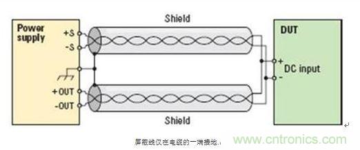 在使用屏蔽電纜時,要確保將屏蔽的一端接地。如圖所示,屏蔽的一端與電源的地接在一起,否則會增加接地電容。