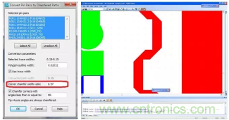 設(shè)計用于射頻和微波的銅箔形狀時,一個很重要的方面是能夠建立帶尖拐角的 Gerber檔。優(yōu)秀的PCB設(shè)計工具可以簡化這一過程。例如,使用50毫米線條繪制形狀與使用50毫米圓形光圈繪圖相比,往往令設(shè)計具有較小的半徑。設(shè)計工具在建立Gerber檔時,可透過正確地自動轉(zhuǎn)換線條寬度來獲得尖拐角(圖 2)。