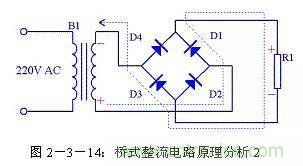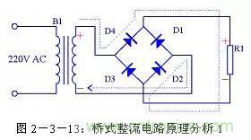 由圖2-3-13可以看出在電源正半周時,B1次級上端為正,下端為負,整流二極管D4和D2導通,電流由變壓器B1次級上端經過D4、R1、D2回到變壓器B1次級下端;由圖2-3-14可以看出在電源負半周時,B1次級下端為正,上端為負,整流二極管D1和D3導通,電流由變壓器B1次級下端經過 D1、R1、D3回到變壓器B1次級上端。R1兩端的電壓始終是上正下負,其波形與全波整流時一致。