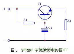 當對濾波效果要求較高時,可以通過增加濾波電容的容量來提高濾波效果。但是受電容體積限制,又不可能無限制增大濾波電容的容量,這時可以使用有源濾波電路。其電路形式見圖2-3-29,其中電阻R1是三極管T1的基極偏流電阻,電容C1是三極管T1的基極濾波電容,電阻R2是負載。這個電路實際上是通過三極管T1的放大作用,將C1的容量放大β倍,即相當于接入一個(β+1)C1的電容進行濾波。