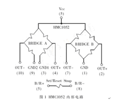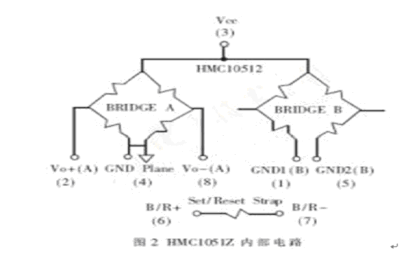 HMC1051Z為HMC1052的單軸版本,其參數(shù)與HMC1052相同。HMC10512內(nèi)部電路如圖2所示。