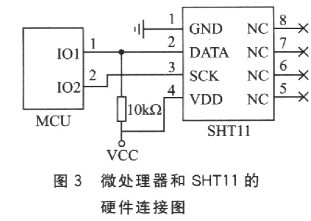SHTl1通過二線數字串行接口來訪問,所以硬件接口電路非常簡單。需要注意的地方是:DATA數據線需要外接上拉電阻,時鐘線SCK用于微處理器和SHTll之間通信同步,由于接口包含了完全靜態邏輯,所以對SCK最低頻率沒有要求;當工作電壓高于4.5V時,SCK頻率最高為10 MHz,而當工作電壓低于4.5 V時,SCK最高頻率則為1 MHz。硬件連接如圖3所示。