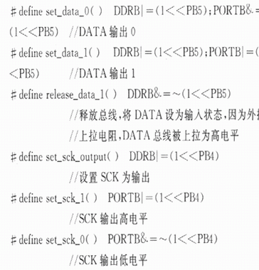 通過以上宏定義,可以實現SCK和DATA總線的各種輸入和輸出狀態。為了模擬該二線串行數字協議,還需要一個延時函數。WINAVR庫函數提供了一個延時函數_delay_loop_2(unslgned char s),該延時函數運行用4個時鐘周期,所以白定義延時1μs函數可以定義如下:#deftne CPU_CRYSTAL 7.3728