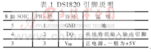 DS1820的PR-35封裝形式見(jiàn)圖1,其外表看起來(lái)像三極管。另外還有8腳SOIC封裝形式,只用3、4和5腳,其余為空腳或不需連接引腳。不過(guò)最常見(jiàn)的形式是PR-35封裝,其引腳說(shuō)明如表1所示。