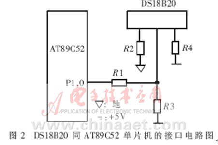 DS18B20的測(cè)溫原理為:內(nèi)部計(jì)數(shù)器對(duì)一個(gè)受溫度影響的振蕩器的脈沖計(jì)數(shù),低溫時(shí)振蕩器的脈沖可以通過(guò)門(mén)電路,而當(dāng)?shù)竭_(dá)某一設(shè)置高溫時(shí),振蕩器的脈沖無(wú)法通過(guò)門(mén)電路。計(jì)數(shù)器設(shè)置為-55℃時(shí)的值,如果計(jì)數(shù)器到達(dá)0之前門(mén)電路未關(guān)閉,則溫度寄存器的值將增加,這表示當(dāng)前溫度高于-55℃。同時(shí),計(jì)數(shù)器復(fù)位在當(dāng)前溫度值上,電路對(duì)振蕩器的溫度系數(shù)進(jìn)行補(bǔ)償,計(jì)數(shù)器重新開(kāi)始計(jì)數(shù)直到回零。如果門(mén)電路仍然未關(guān)閉,則重復(fù)以上過(guò)程。溫度轉(zhuǎn)換所需時(shí)間不超過(guò)750ms,得到的溫度值的位數(shù)因分辨率不同而不同[2]。DS18B20同AT89C52單片機(jī)的接口電路如圖2所示。這種接口方式只需占用單片機(jī)一根口線,與智能儀器或智能測(cè)控系統(tǒng)中的其它單片機(jī)或DSP的接口也可采用類(lèi)似的方式。