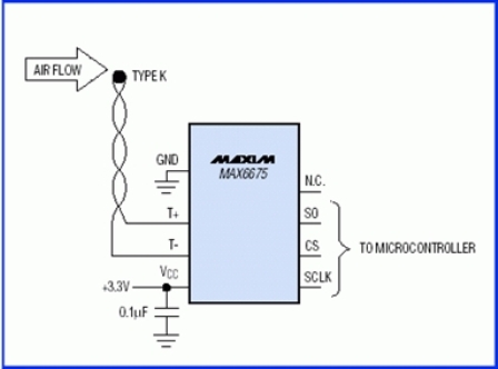圖1. 采用熱電偶測量環(huán)境溫度,MAX6675提供冷端補(bǔ)償,并將熱電偶輸出轉(zhuǎn)換成數(shù)字形式。