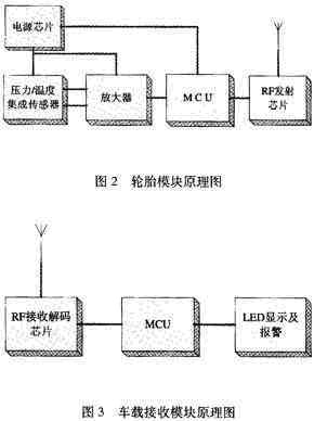 該系統的工作原理如下,把輪胎模塊裝置在輪胎內,壓力和溫度傳感器檢測輪胎內部當前的應力和溫度信息,獲得的模擬信號經過A/D變換器轉換成數字信號,然后通過射頻發射器發送出去。車載接收模塊裝置在駕駛室內,射頻接收器接收來自輪胎模塊的應力和溫度信息,當輪胎壓力過高或者過低時,通過顯示和報警裝置發出報警信息。