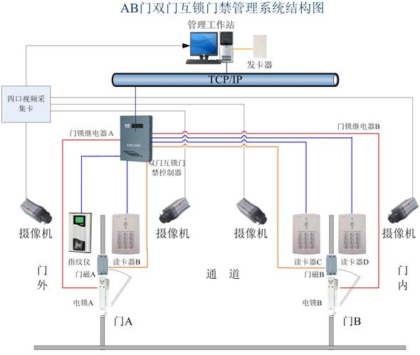 首先解釋一下AB門雙門互鎖的概念,所謂雙門互鎖聯(lián)動是指AB兩道門具有互鎖聯(lián)動的功能,即當(dāng)一道門被打開時,另一道門將打不開,只有當(dāng)兩道門都關(guān)上時,才能打開其中的任一道門。在高安全場所通道門禁應(yīng)用中,特定人員進入第一道門后必須要按照操作要求鎖好第一道門才能進入第二道門,如進入第一道門后沒按要求關(guān)好此道門,將不能進入第二道門,這樣做的目的是為了防止犯罪分子尾隨作案。